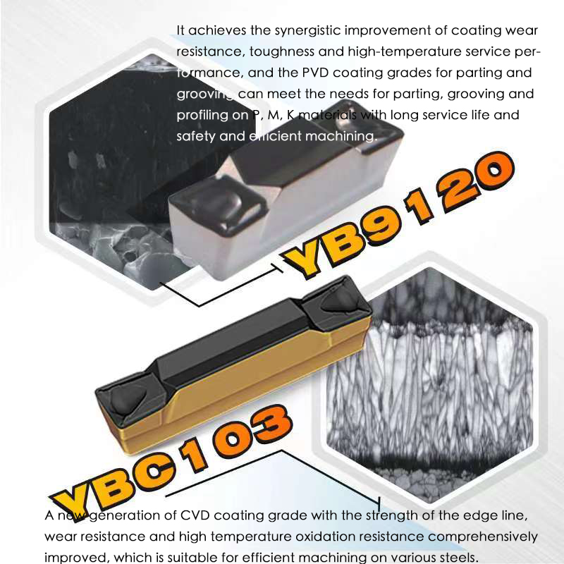 It achieves the synergistic improvement of coating wear resistance, toughness and high-temperature service performance,and the PVD coating grades for parting and grooving can meet the needs for parting,grooving and profiling on P, M, K materials with long service life and safety and efficient machining.