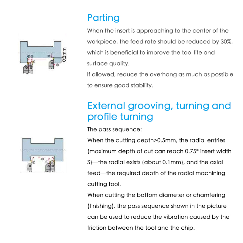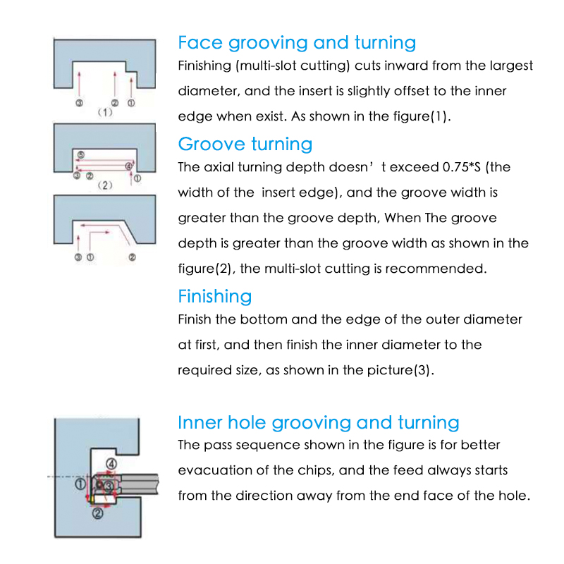 The axial turning depth doesn’t exceed 0.75*S (the width of the  insert edge),and the groove width is greater than the groove depth, When The groove depth is greater than the groove width as shown in the figure(2), the multi-slot cutting is recommended.