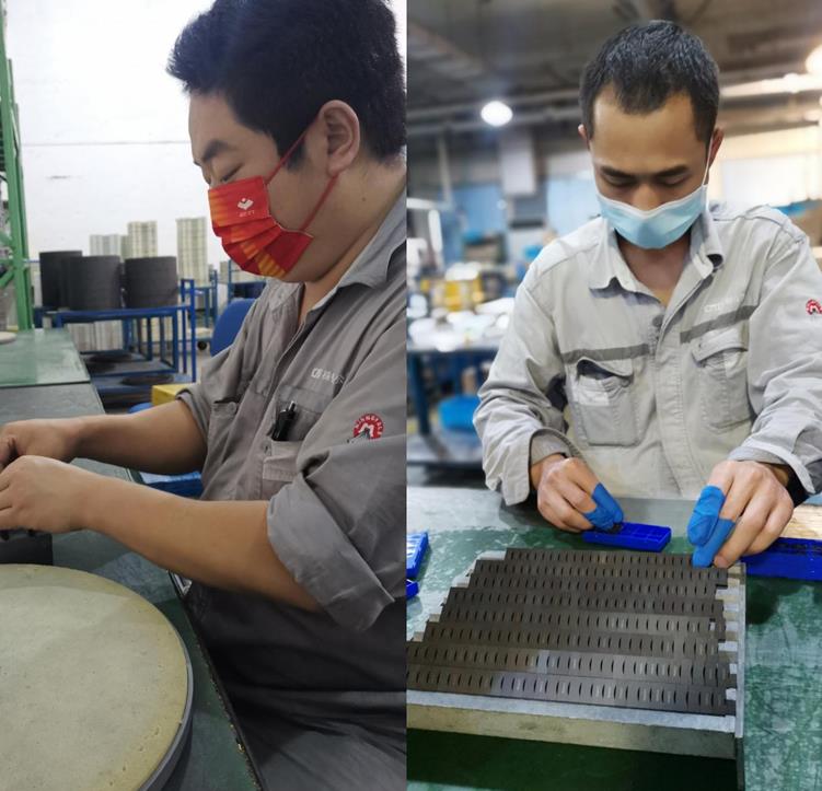 駐廠當日,由于時間緊迫,保證品種的毛坯供應(yīng)成了當務(wù)之急。為發(fā)揮駐廠生產(chǎn)團隊的最大生產(chǎn)效率,盡快完成銷售催急品種的生產(chǎn),在嚴格遵守疫情防控要求的情況下,駐廠生產(chǎn)團隊積極配合,制定生產(chǎn)組織方案,“無死角”做好生產(chǎn)保障工作,確保品種的及時交付。在人員相對緊缺的情況下,駐廠人員為盡快完成催急品種,主動請纓延長上班時間。閉環(huán)生產(chǎn)第一天,刀片一廠碩果累累,壓制工序超額完成11個品種的壓制;燒結(jié)工序在人員數(shù)量減半的情況下維持6臺壓力爐和1臺真空爐的正常運行,保障壓制當天壓坯和燒結(jié)產(chǎn)品的及時轉(zhuǎn)出。