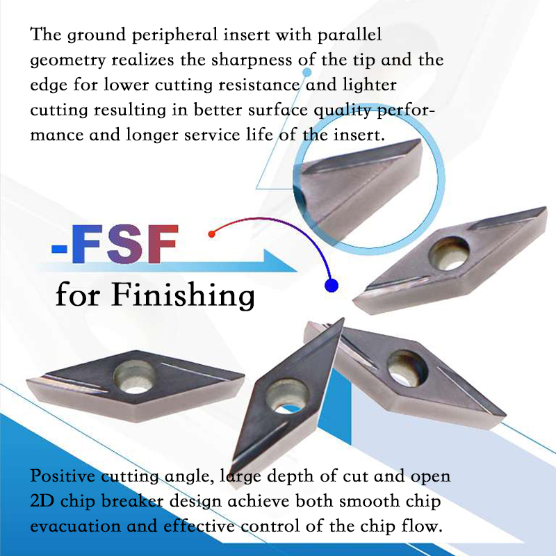 The ground peripheral insert with parallel geometry realizes the sharpness of the tip and the edge for lower cutting resistance and lighter cutting resulting in better surface quality performance and longer service life of the insert.