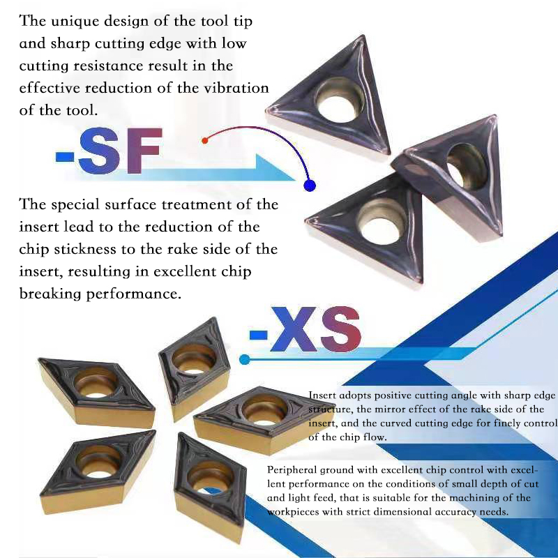 Insert adopts positive cutting angle with sharp edge structure, the mirror effect of the rake side of the insert, and the curved cutting edge for finely control of the chip flow.